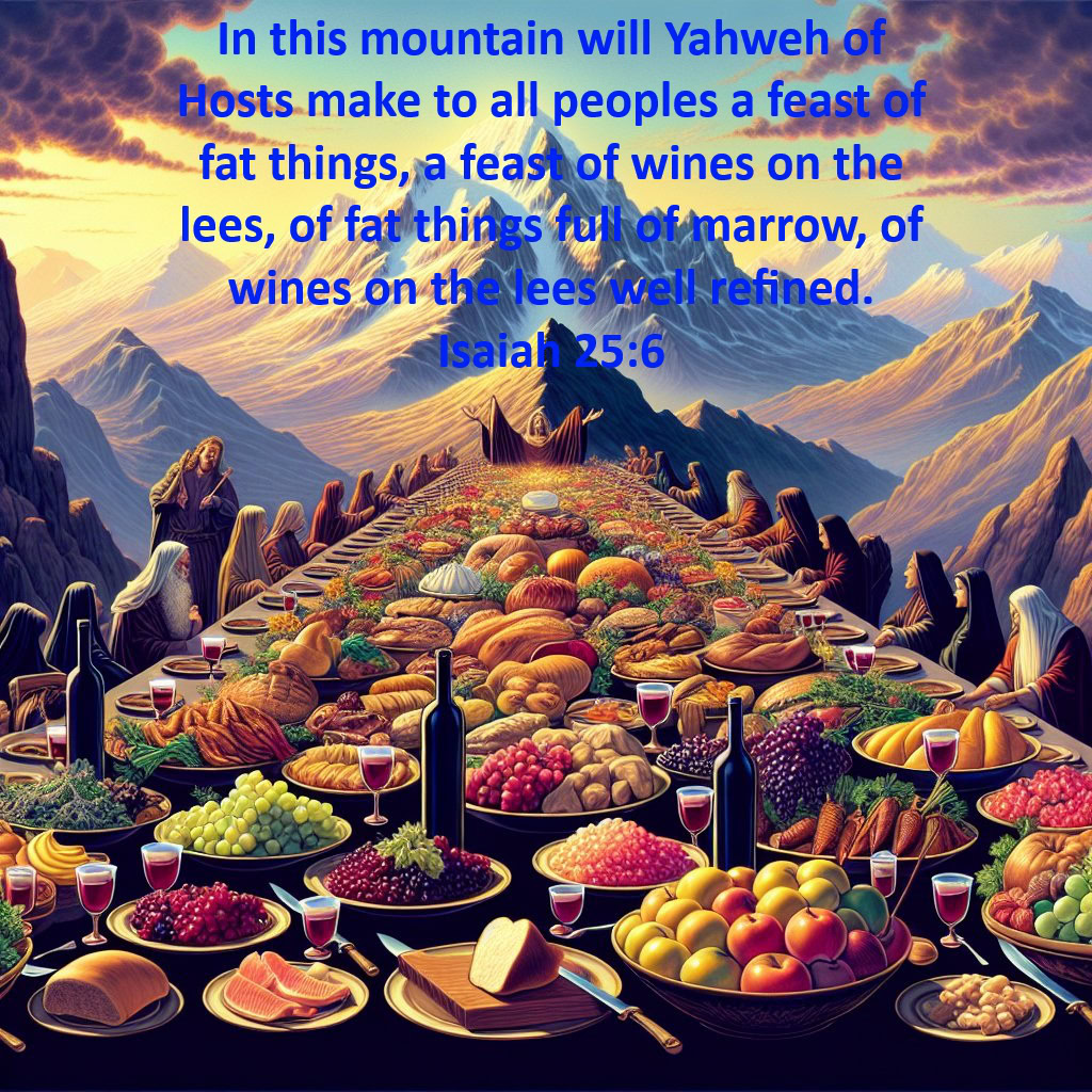 6 In this mountain will Yahweh of Hosts make to all peoples a feast of fat things, a feast of wines on the lees, of fat things full of marrow, of wines on the lees well refined.