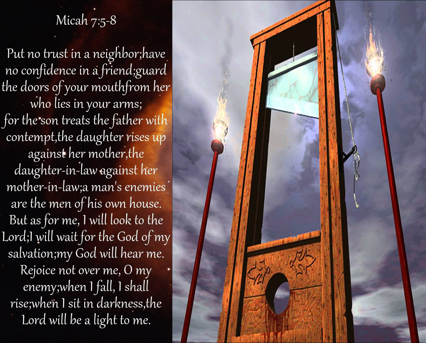 Micah 7 describes the level of family betrayal during the time of the Great Tribulation or the Beast, Image & Mark! Christ was quoting from Micah 7 when he spoke of family division at Matthew 10:21- 22, 34-39.